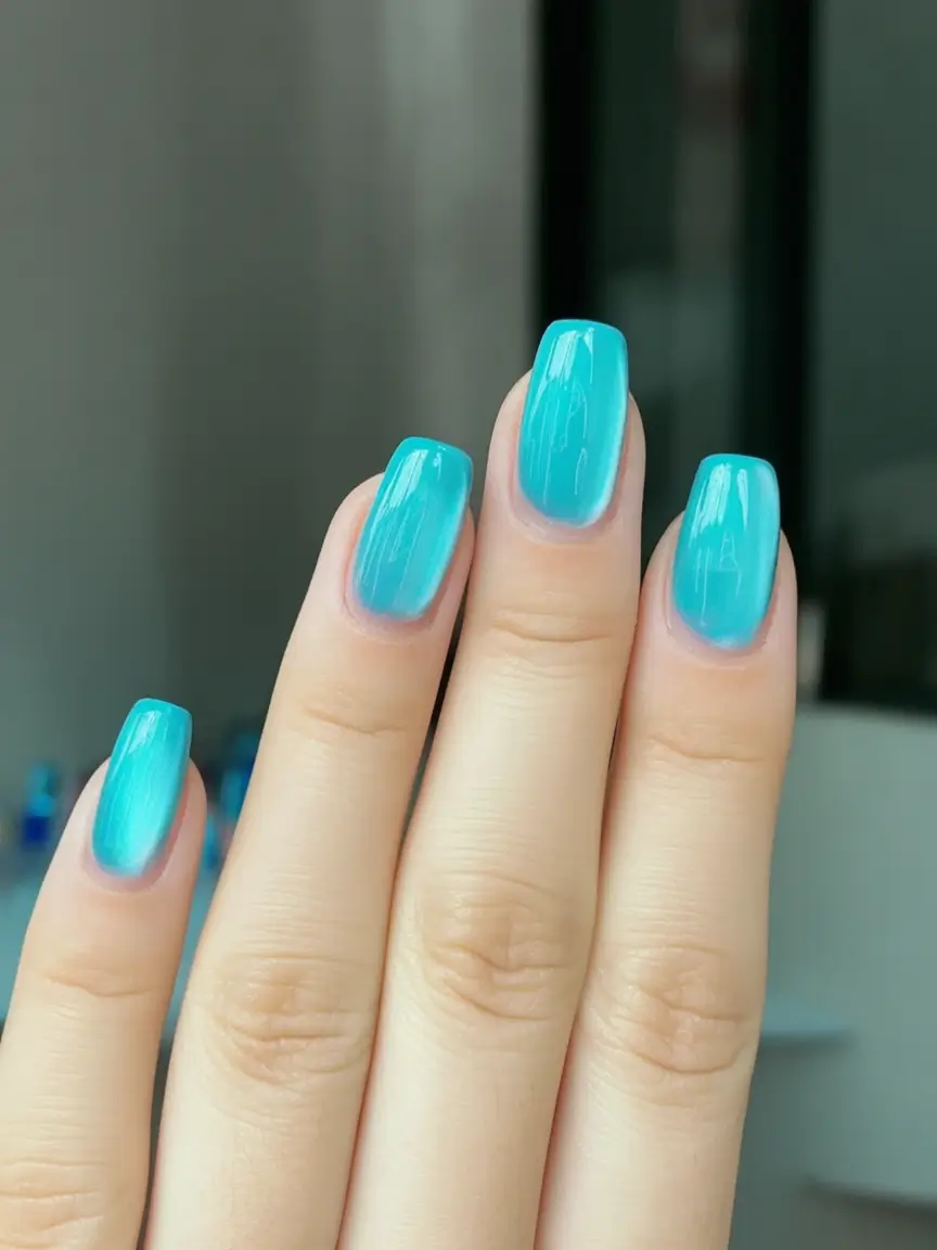 To achieve this watery glow, I layer a bright turquoise gel base – something like Gelish Tahiti Hottie – under a matching cat eye shade. On shorter nails, I hold the magnet straight along the center axis to elongate visually, a small shaping trick often recommended in salon tutorials for spring cat eye nails design on compact lengths.