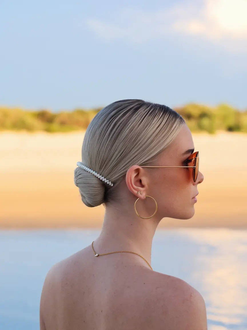 This bun is stylish, practical and looks stunning with the pearl detail. It’s held low and tight, so it stays in place when you’re swimming all day. You can move from the pool to dinner without changing anything about your look. And let’s be honest, pearls in your hair? It’s giving old Hollywood meets vacation chic.