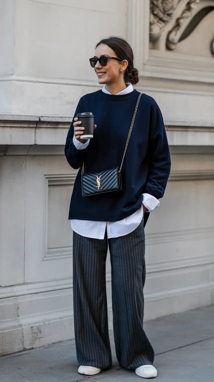 Navy has this quiet authority in winter that I always gravitate toward. Layering a relaxed navy sweatshirt over a crisp white shirt and pairing it with pinstripe trousers creates that perfect blend of structure and comfort – the sweet spot for Work, running errands, or traveling through cities like Amsterdam or London where February air moves from cold to mild in a single afternoon. It’s stylish without being loud, polished without feeling overworked, and honestly perfect for anyone searching for elevated outfits ideas in February.