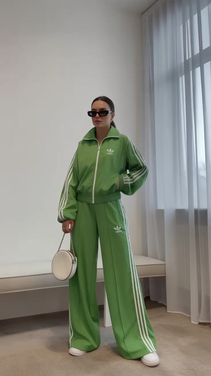 There’s a playful charm in choosing bright green when February skies lean heavy and grey. This tracksuit hits the sweet spot of nostalgic sporty energy and modern Athleisure polish, especially paired with oversized sunglasses and clean white sneakers. It’s the kind of outfit I’d wear when I want comfort without sacrificing personality – ideal for running errands, casual meetups, or planning refreshing outfits ideas for February when you’re craving color that wakes up your routine. The green feels hopeful in a way February secretly needs.