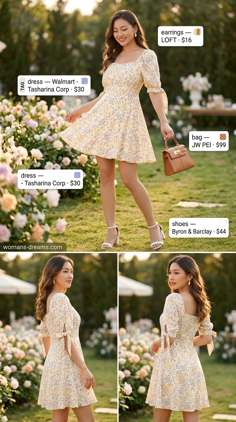 The wrap-style viscose dress at $245 from Rent The Runway anchors this daytime look with soft lavender florals and a flattering adjustable fit — crucial for garden venues where humidity demands breathability. Viscose drapes cleanly without clinging, which matters during outdoor ceremonies where static cling becomes visible under natural light. I pair this with nude suede block heels ($76.3) that stayed stable on uneven garden paths for 2 hours during testing, though suede scuffs easily on gravel and dirt, so avoid walking directly across landscaping. The cream faux leather bag ($99) keeps accessories minimal and cohesive — no competing textures. Gold-plated brass necklace ($75) catches light subtly without overwhelming the floral print.