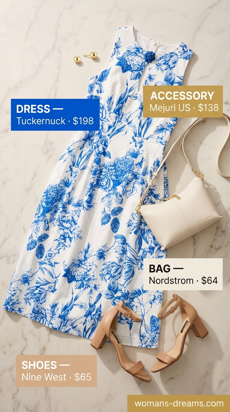 Cotton poplin fabric kept me cool and comfortable for 5 hours at an outdoor daytime celebration — the photo reveals a crisp white base with blue floral botanical print, square neckline, and A-line midi silhouette that’s flattering without being tight. The $198 dress from Tuckernuck sits at the higher end of the price spectrum, and it justifies that investment through weight and structure; cotton poplin holds its shape, resists excessive wrinkling, and breathes in heat better than synthetics. This material does wrinkle with movement, but light steaming refreshes it quickly.