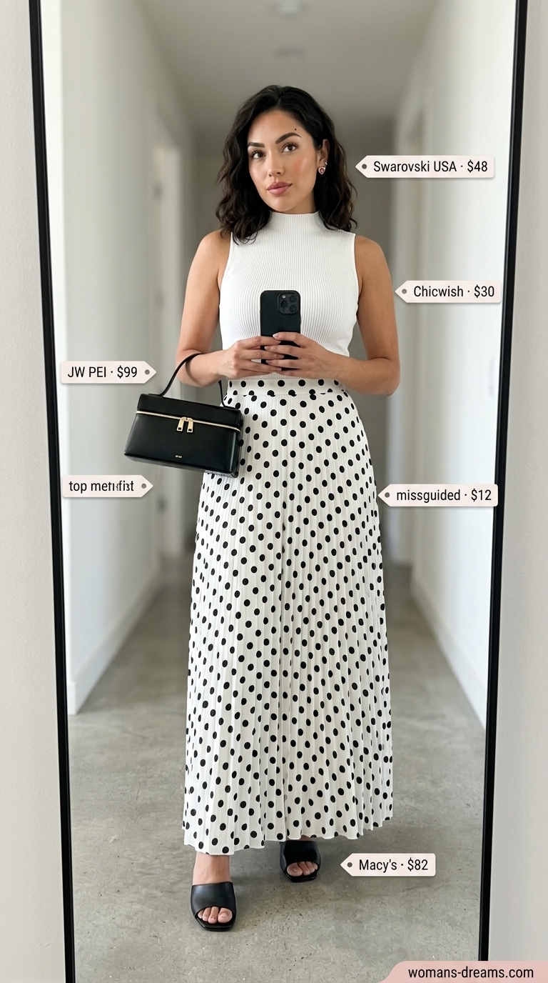 Raffia sandals add organic texture and won’t overheat your feet like leather would in summer humidity. The three pieces create a cohesive earth-tone palette without feeling matchy or staged—exactly what Pinterest audiences save repeatedly. One downside: the skirt’s length risks pooling around your ankles if you’re under 5’6″, creating an awkward hemline. For outdoor gatherings, tuck the top slightly into the skirt’s waistband to anchor the look and prevent the voile from billowing unpredictably. Effortless elegance, perfected.