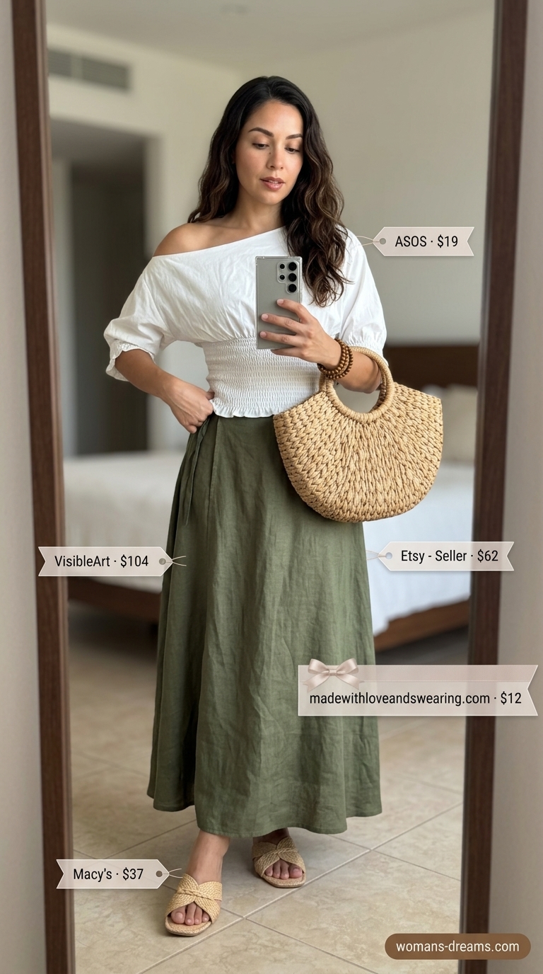 A $104 linen-blend skirt in olive green forms the anchor of this outfit, paired with a $18.74 cotton voile top and $36.75 raffia sandals—total $159.49 before accessories. The cotton voile kept me cool during a 90-degree outdoor gathering, which matters because breathability prevents sweat stains on lighter fabrics during long events. Linen wrinkles aggressively; accept it or use a wrinkle release spray before you leave home. The skirt’s flowing silhouette balances the off-the-shoulder neckline without creating bulk at the waist.