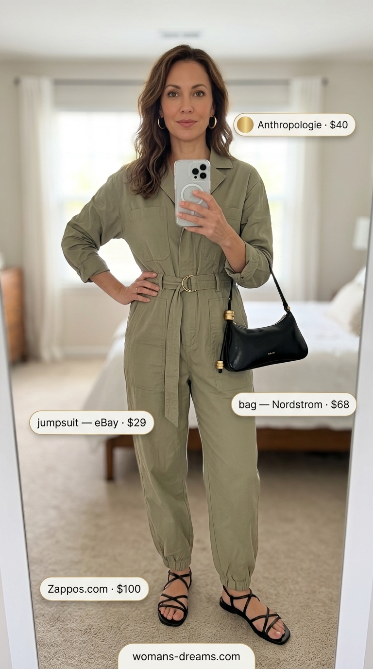 $29 utility romper in khaki green tencel blend strikes that edgy-lite balance without overshooting downtown cool. The self-tie belt cinches the waist for actual shape; gold-plated brass hoop earrings at $40 add modern punch. Black leather strappy sandals ($100) stay minimal so the romper stays the star, while faux leather faux leather on the compact black bag ($68) held up well through a full city day without scuffing. Skip this if you need to carry more than essentials — the shoulder bag is tiny.