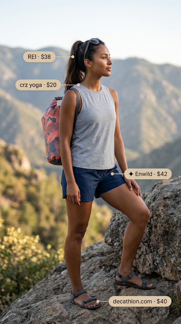 $145 synthetic hiking shoes plus $56 nylon/spandex shorts plus an $80 waterproof fanny pack equals a outfit built for river trails where dry valuables actually matter. The khaki shoes pair with navy shorts and an aqua moisture-wicking tank — the color harmony feels cohesive rather than random, which Pinterest rewards. Quick-dry nylon construction on the shorts means you won’t sit in cold, clammy fabric after wading through shallow sections. The TPU laminated fanny pack keeps phones and keys completely sealed, eliminating that paranoia about spray and splashes.