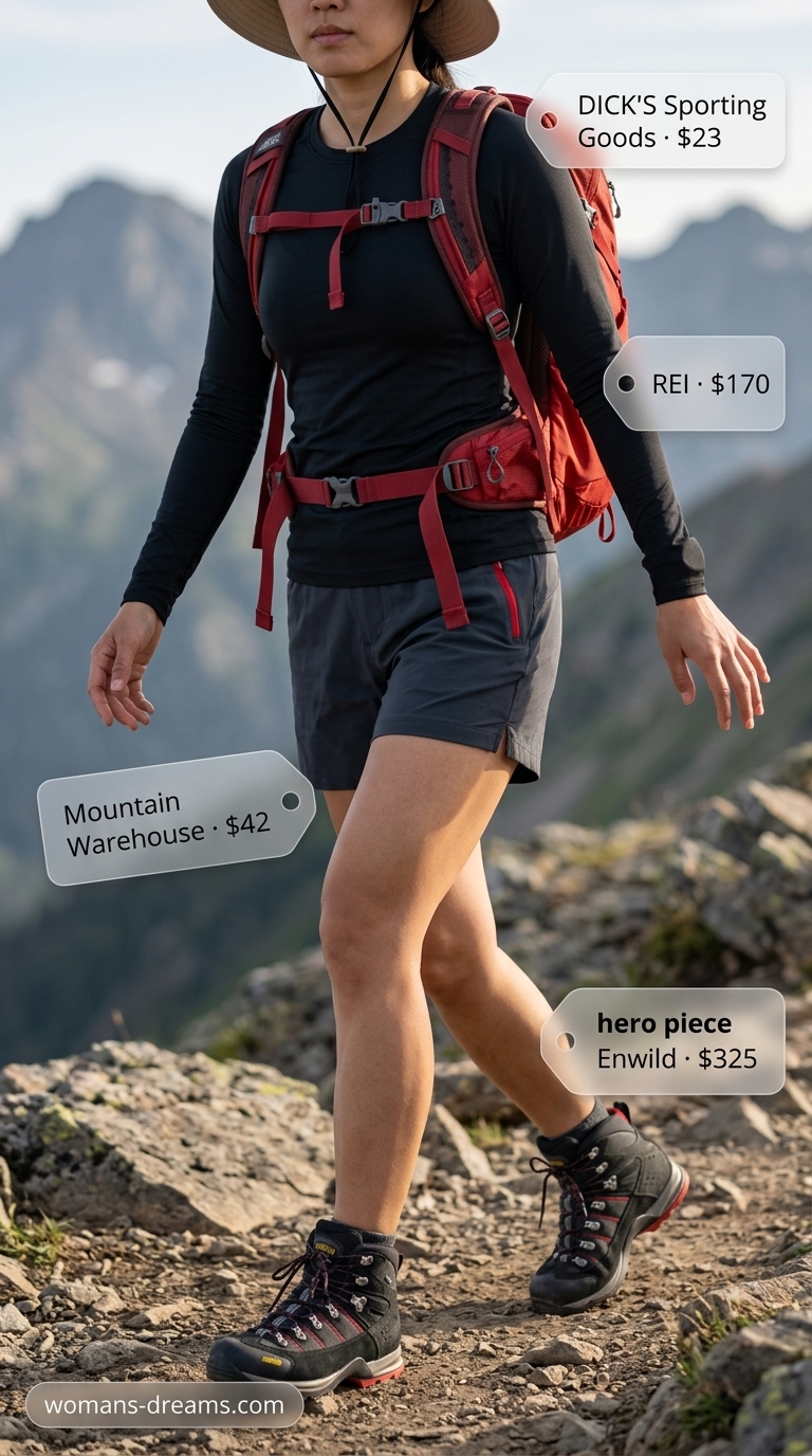 $230 hiking boots in black/gray synthetic dominate this outfit because foot protection determines whether a 10-mile summit attempt ends triumphantly or in blisters that sideline you for weeks. The rubber sole grips varied terrain; the synthetic upper breathes better than full leather while shedding water faster. Photo shows professional lacing structure — tight at ankles, looser at instep — which prevents pressure points during 4+ hour ascents. Nylon/spandex cargo shorts ($15, olive green) offer 5-7 inch inseam for thigh coverage; longer cuts prevent chafing that develops during repetitive climbing.