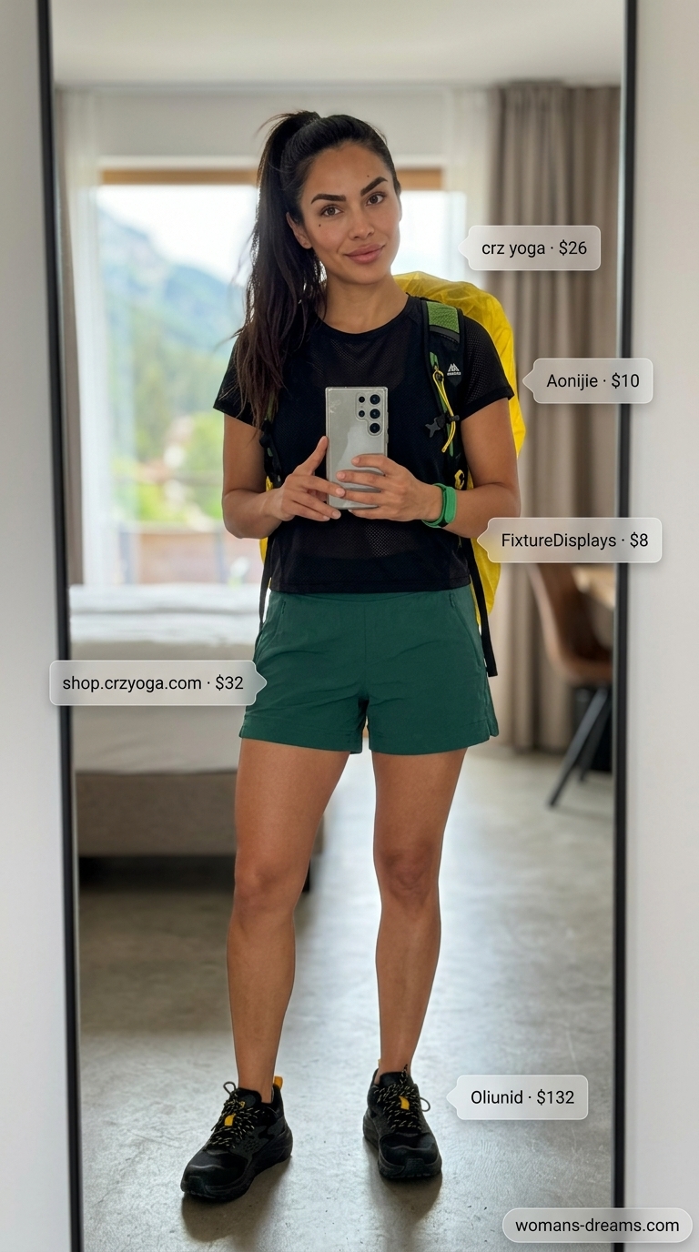 Emerald green shorts at $32 pair with a black mesh top and Gore-Tex trail shoes for serious wet-weather hiking. The photo shows exactly what the brief promises: deep emerald shorts with visible zip pockets, black technical tee, and a bright yellow rain cover slung across the back. Nylon/Elastane blend shorts feature DWR (Durable Water Repellent) finish—meaning light rain beads off instead of soaking through. Rubber-sole shoes grip muddy, slippery terrain where cotton or canvas would fail spectacularly. The yellow backpack cover isn’t decoration; high-visibility color matters when dense foliage blocks sight lines during a downpour.