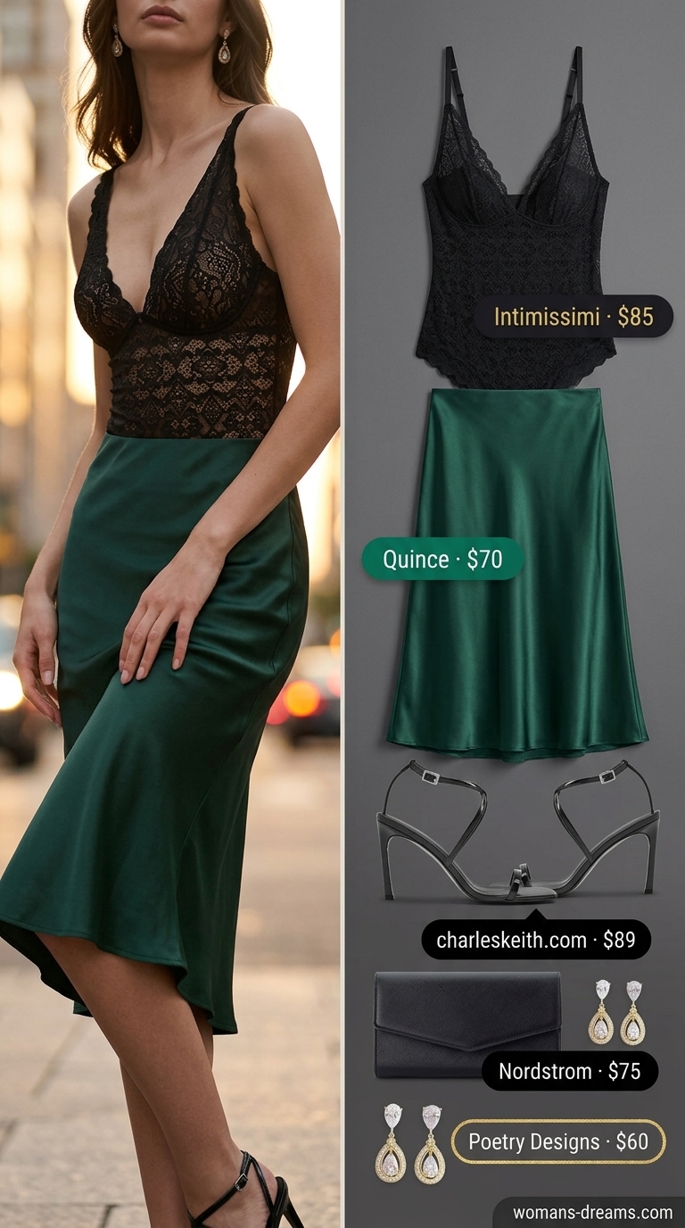 The $85 nylon-lace bodysuit in black delivers sophistication without apology — the deep color against an emerald-green satin skirt ($69.90, Quince) creates a jewel-tone pairing that photographs richly. Patent leather heeled sandals ($89, Charles & Keith) with minimal straps elongate the leg and let the skirt’s bias-cut silhouette take center stage. Satin charmeuse moves like fabric should on a date night, but—and this matters—the material can watermark if exposed to rain or humidity without quick drying, so plan accordingly for venue and weather.