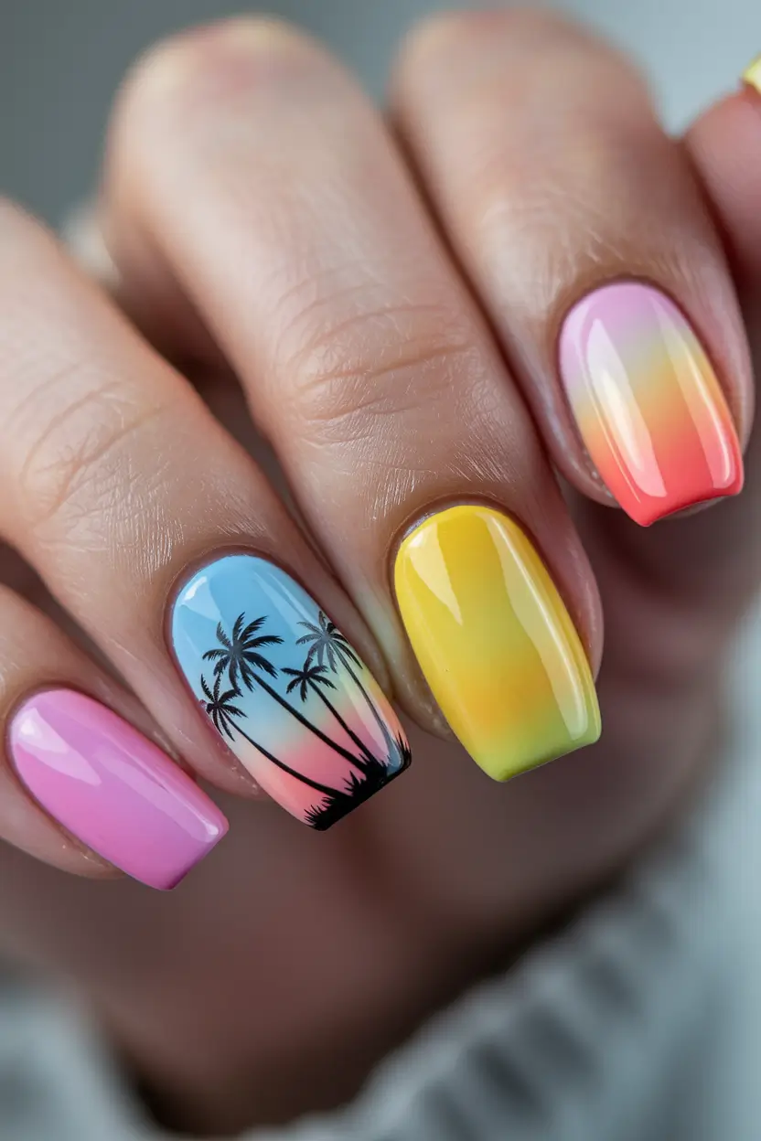 The ideas here are all about doing summer beach-themed nail art. The combination of pink, coral, yellow and palm trees makes any space feel like a vacation, even if you’re not actually on one. The square tips keep it fresh and modern. It’s definitely one of the more intricate summer nail art ideas 2025, but it’s also one of the most rewarding visually.
