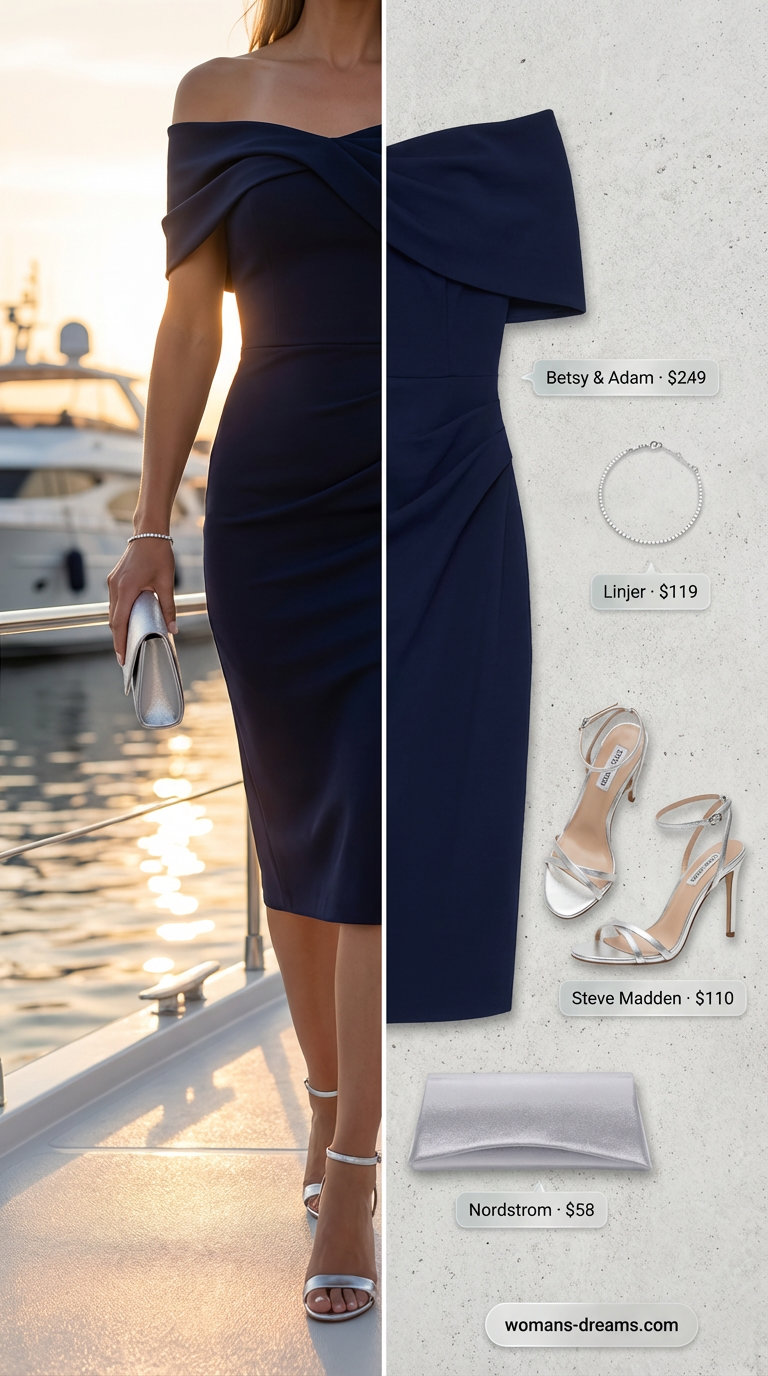 Navy crepe sits between casual and formal — structured enough for a dinner cruise, soft enough that movement doesn’t feel armored. Sleek silver metallic accessories ground the palette without going glittery or overdone. This outfit captures refined elegance for evening events where understated wins over spectacle.