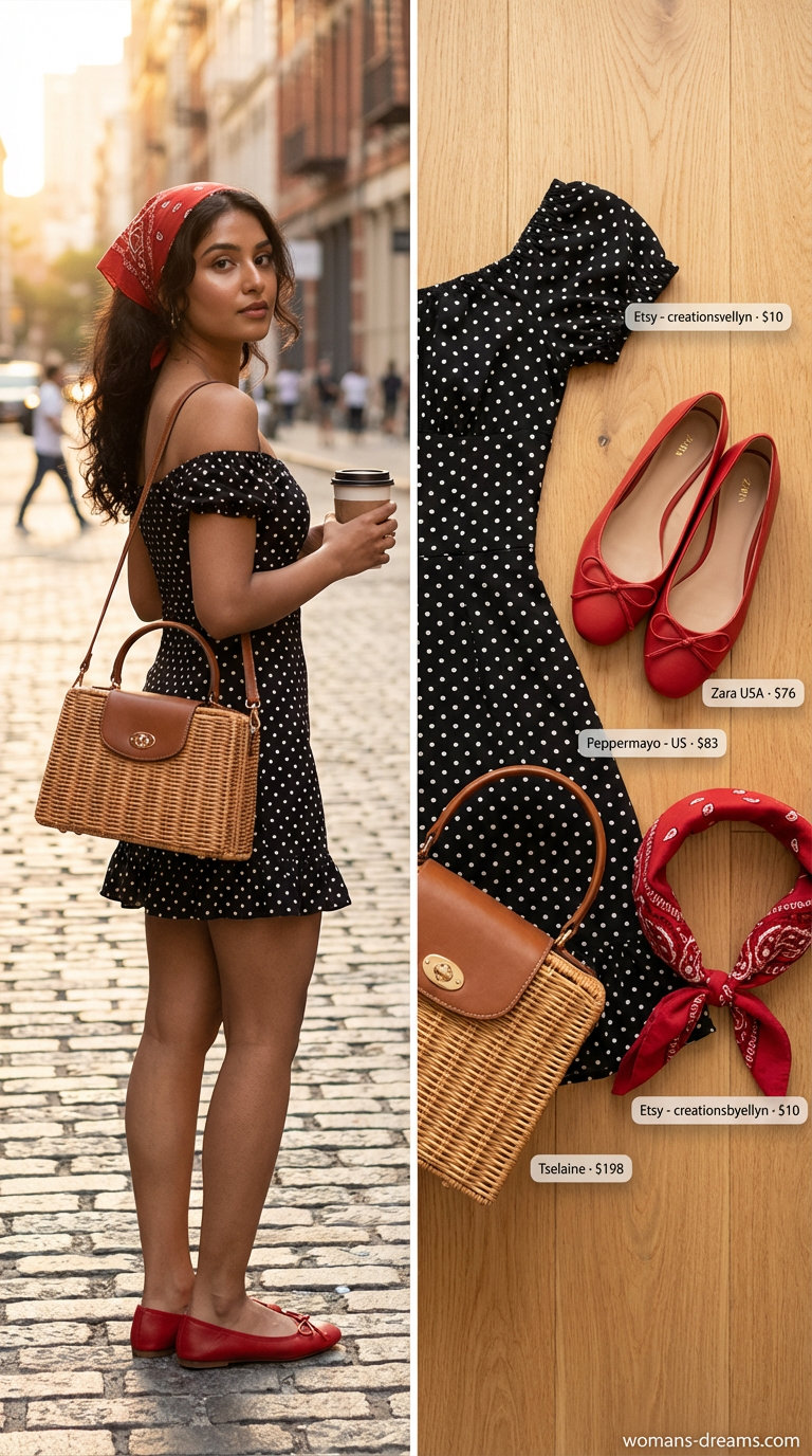$83 cotton-blend dress in classic black and white polka dots anchors this retro picnic look—the print is timeless, and cherry red ballet flats ($75.90) punch the palette without overshadowing the statement pattern. The natural wicker picnic basket ($198) reads charming but demands honesty: it’s bulky and won’t compress for day trips with light cargo. Cotton blend breathes for outdoor hours, though wrinkles will emerge mid-afternoon on humid days. Red bandana, gold hoops, and that woven bag create visual rhythm across 3 pieces that cost $366.40 combined. Woven basket and faux leather strap survive picnic essentials—sandwiches, blankets, sunscreen—without structural compromise.
