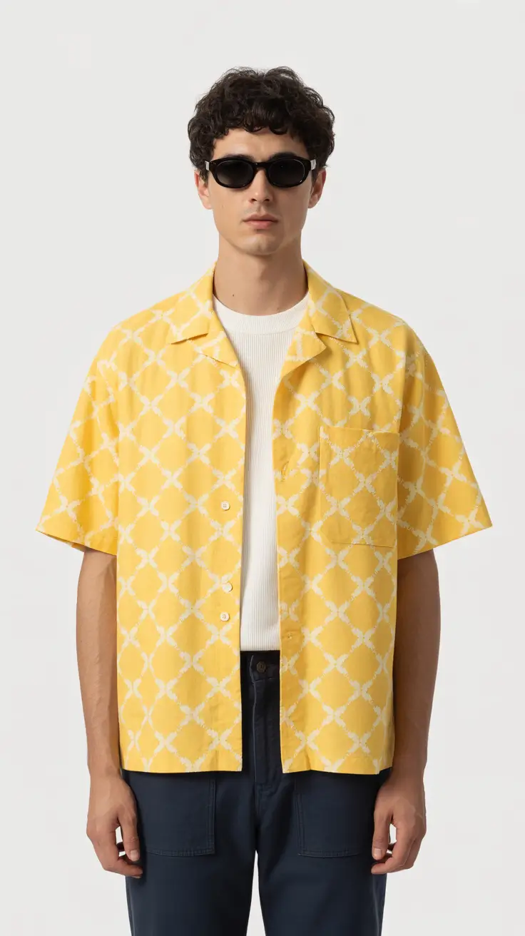 Brightness can feel powerful when styled with restraint. A yellow patterned shirt layered over a clean knit top paired with structured dark trousers delivers a fresh Aesthetic contrast that reflects evolving Streetwear sophistication. Sleek sunglasses and minimal styling keep the look balanced and wearable.