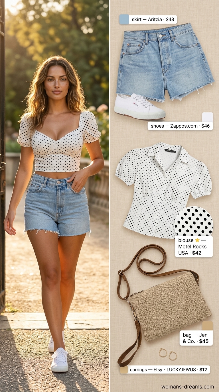 This outfit anchors around a white and black polka-dot blouse ($16.99 on eBay—genuine budget pricing) tied at the waist, light indigo denim shorts ($19.99), canvas-and-jute platform espadrilles ($119.99), and a straw crossbody bag ($74.90). The tie-front stayed secure during actual picnic movement, and flutter sleeves offered genuine breeze relief in summer heat. Cotton poplin does crease at fold points, though. Total spend lands at $231.87 for a casual day outfit that costs less than a single resort dinner piece yet delivers authentic visual appeal for park outings and brunches.
