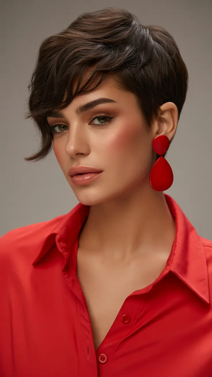 This pixie is all about volume and direction. The longer top is swept to the side, creating that soft wave effect, while the shorter sides keep everything clean and structured. The rich brunette shade adds depth, making it a standout among short haircut ideas for summer that lean more refined.