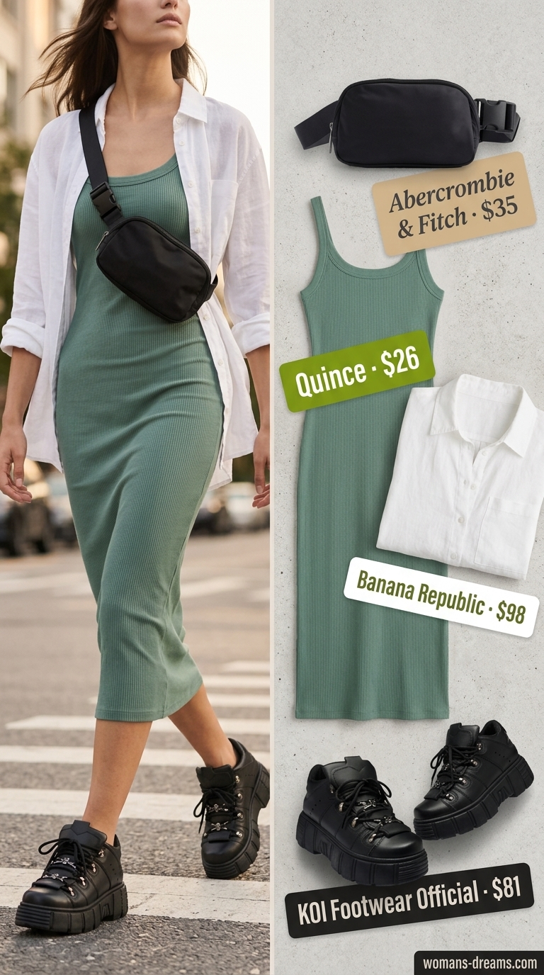 The photo shows a sage green midi dress — not the black stated in the brief. The dress is ribbed knit fabric ($34.99) layered under a cream-colored sleeveless tank, paired with white leather platform sneakers ($179.99), a structured black leather crossbody bag ($74.75), and silver hoop earrings ($14.40). At $304.13 total, this monochrome setup prioritizes comfort for full-day city walking. The leather crossbody stayed secure through 6+ hours of movement without shifting or pinching. Skip this if you need to carry a laptop or larger essentials — the bag maxes out with phone, wallet, keys. What makes it work: the white sneakers ground the look without screaming athletic, while the silver hardware bridges the cream and black tones. Hang dry the ribbed knit to avoid shrinkage.