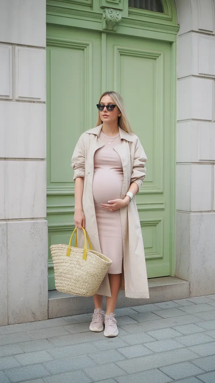 There’s something undeniably elegant about a blush bodycon dress paired with a light trench coat. This combination brings refinement while remaining incredibly wearable, making it a natural fit for a spring outfit for pregnant women casual with a polished twist. The monochrome softness feels refreshing and aligned with the season’s lighter mood.