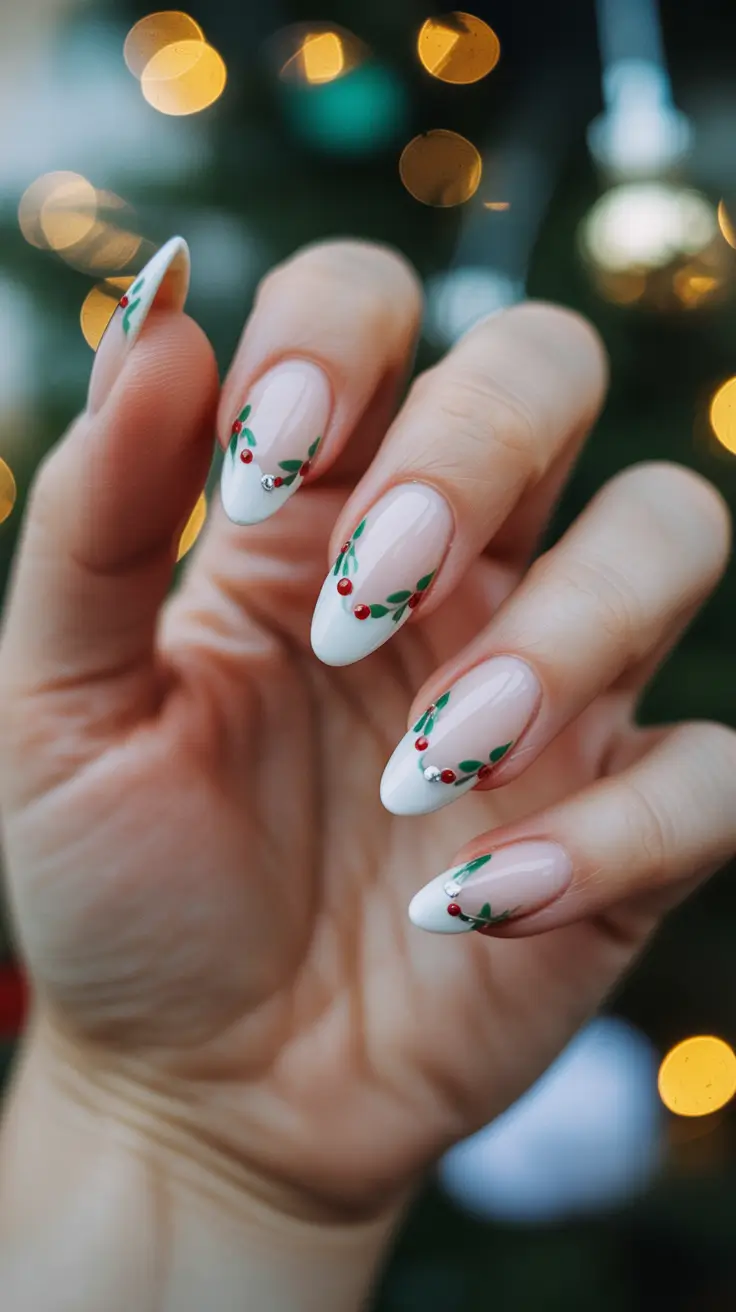 I want something adorable, charming, and slightly nostalgic every December, and this manicure with the holly nails fits the description perfectly. The square christmas style french tip nails has crisp white tips that are dotted with tiny red berries and green leaves to give it a playful touch on winter. It is not too cheerful and will make evenings when you are wrapping presents or drinking cocoa a lot more comfortable.