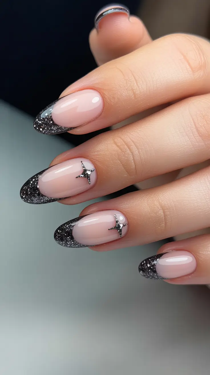 Midnight Spark – Black Glitter French Tips